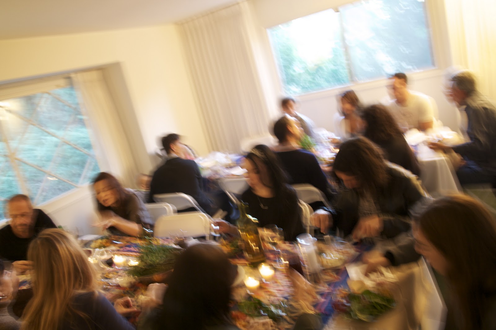 Thanksgiving can be summed up in one word for me this year. Alcohol..... Lots and lots of alcohol. Normally I take table setting and entertaining very seriously. Being that this year was my time to shine, and the turkey torch had been passed my way, you would have thought I would have stayed sober enough to at least light some candles, set the table and take some photos...Nope. Let me re-phrase this.. I got so drunk I made a speech to all my guests, congratulating my "fellow Americans on our win against the British." Thanksgiving was the celebration NOT the 4th of July. Now this may have been a "had to be there moment" or it may have been a "get this girl some water" moment. Either way it was an awkward experience for everyone involved including myself. Apparently I took these photos of my uncompleted table scape's and my sister snapped a few of me and G. I also took one at some point of the crowd chowing down. This particular blurry view basically became the way I was seeing my first turkey day go down.HA! if I wasn't laughing I would be crying :}