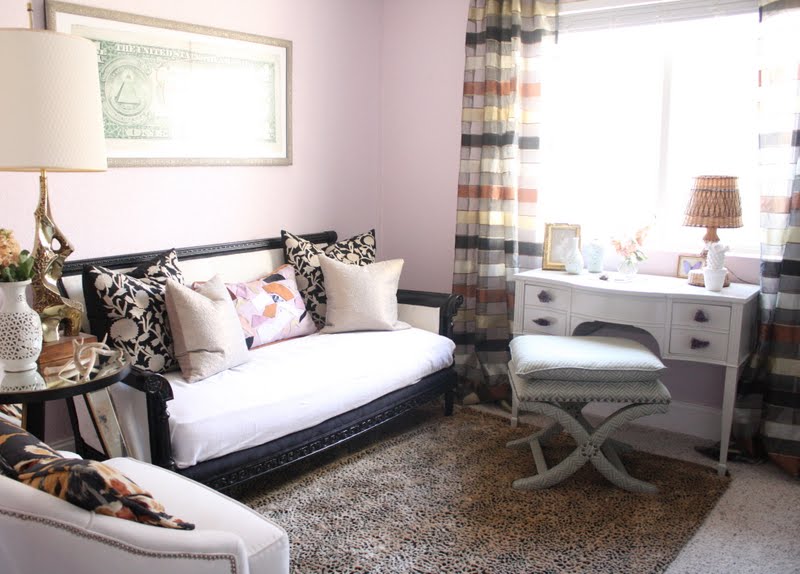 Hi there dearest readers of Amber's blog...whose blog I truly do enjoy. It is a pleasure to be able to play with you all today. I mean who wouldn't want to play dress up of the home...especially the non-committal kind. Anyway I had this lavender guest room just hanging out and since I have a handful of children I decided to make my styling come to life in a place that I could lock up if needs be. For starters I recruited my husband to haul the black and white sofa into the room. The sofa actually has a damask print seat cushion and needs to be updated to my liking but for this exercise we went with the rigging method. In fact I do not think I have ever rigged as many things in my life until I had a handful of kids. You learn to do that on the fly when managing a home with a bunch of little ones and resources are slim. With that being said don't look too closely because you will see a tablecloth wrapped around the sofa cushion, fabric folded on the side brass chair that clearly is covering the gold vinyl cushion and a set of curtains that may be thumb tacked to the wall. I tried really hard to use what I already had around the house but I must admit that through doing this that I finally took fabric that I had sitting around and turned them into the curtains and pillows that they were meant to be (thank you Amber).